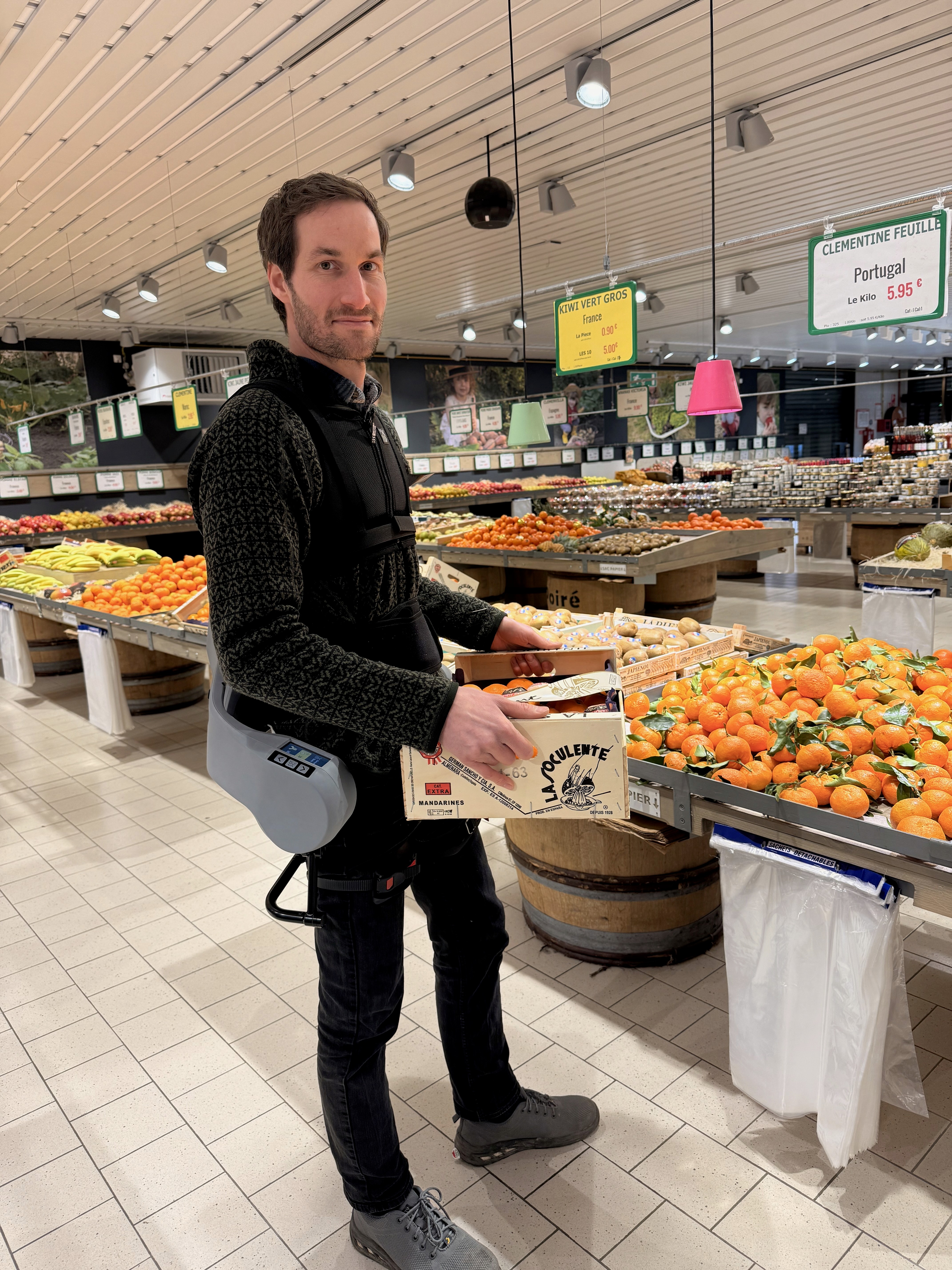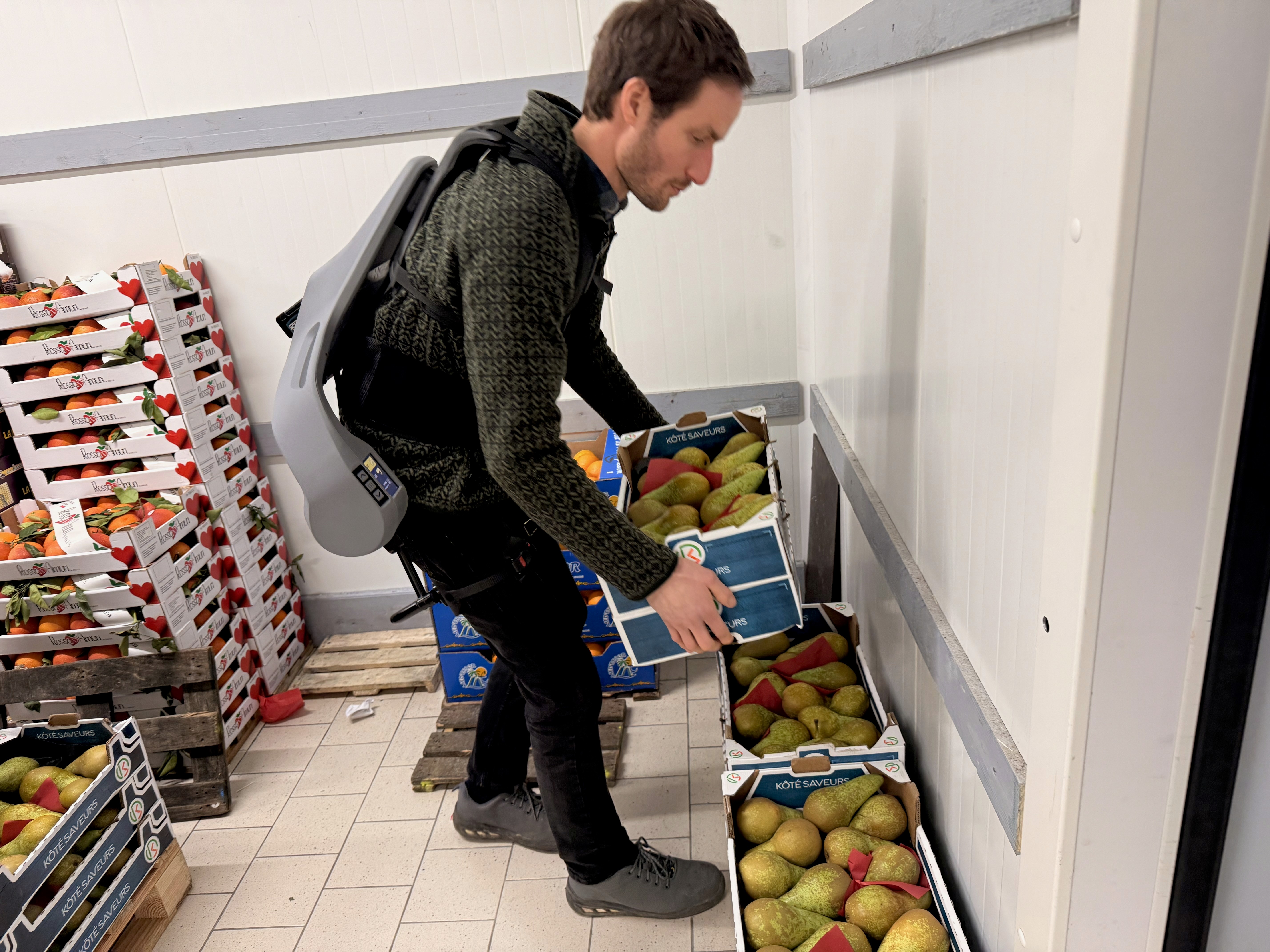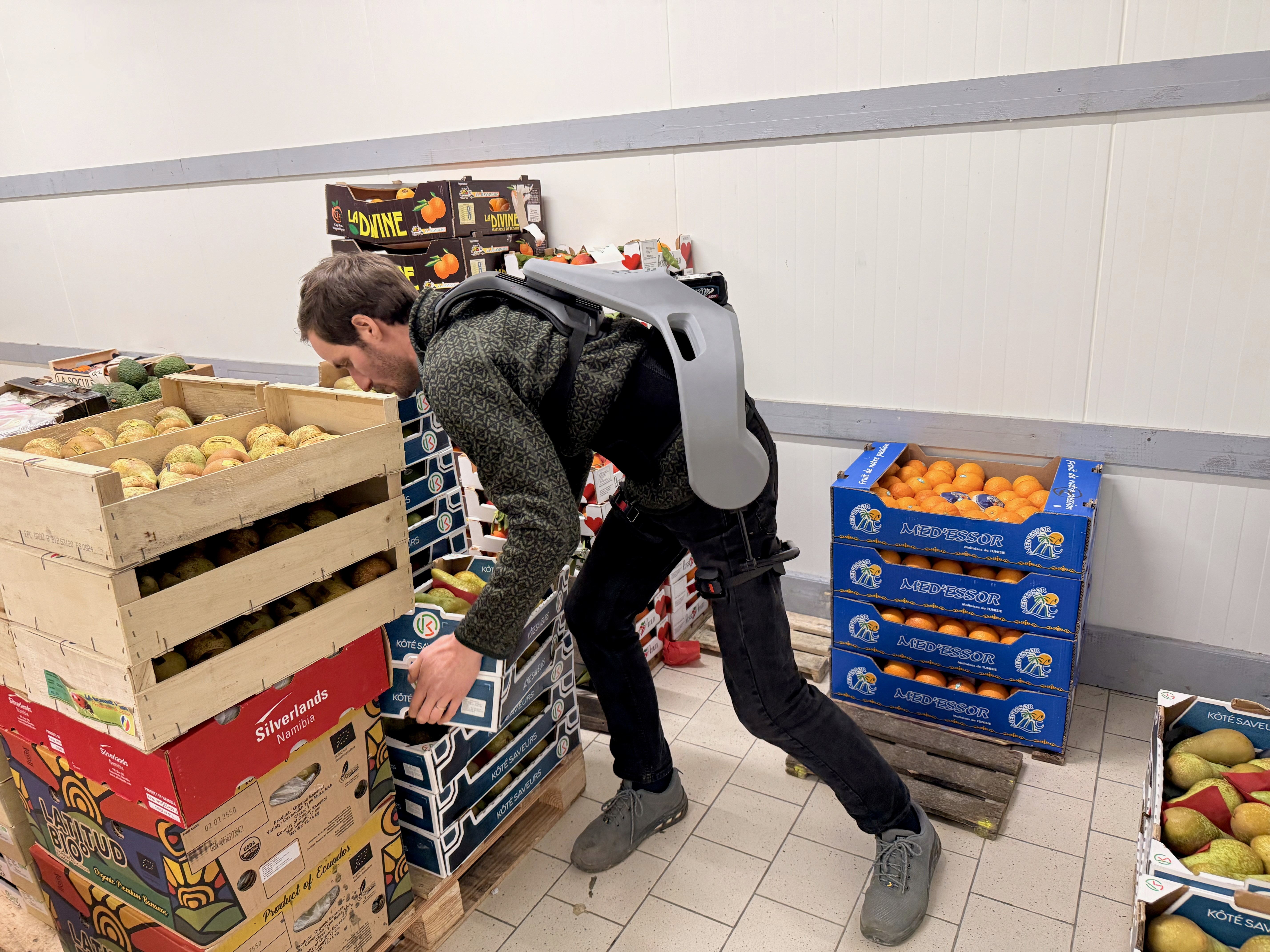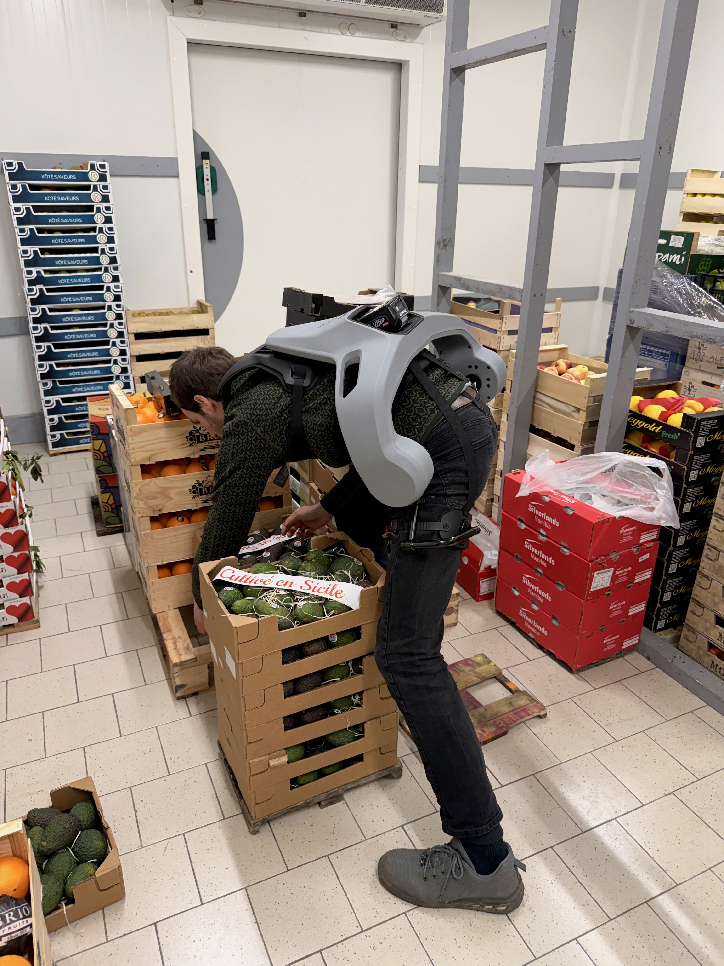 As in many retail and wholesale environments, repetitive crate handling at fresh produce retailer LibreFruit in France led to cumulative strain. Integrating our Exia exoskeleton has reduced muscular effort and fatigue – demonstrating how Physical AI can protect people wherever fresh goods are moved by hand.